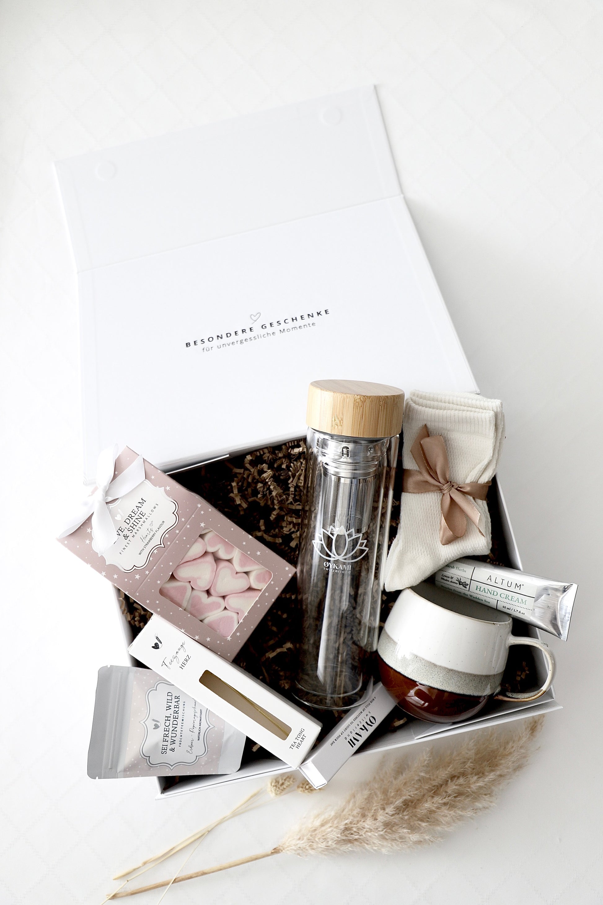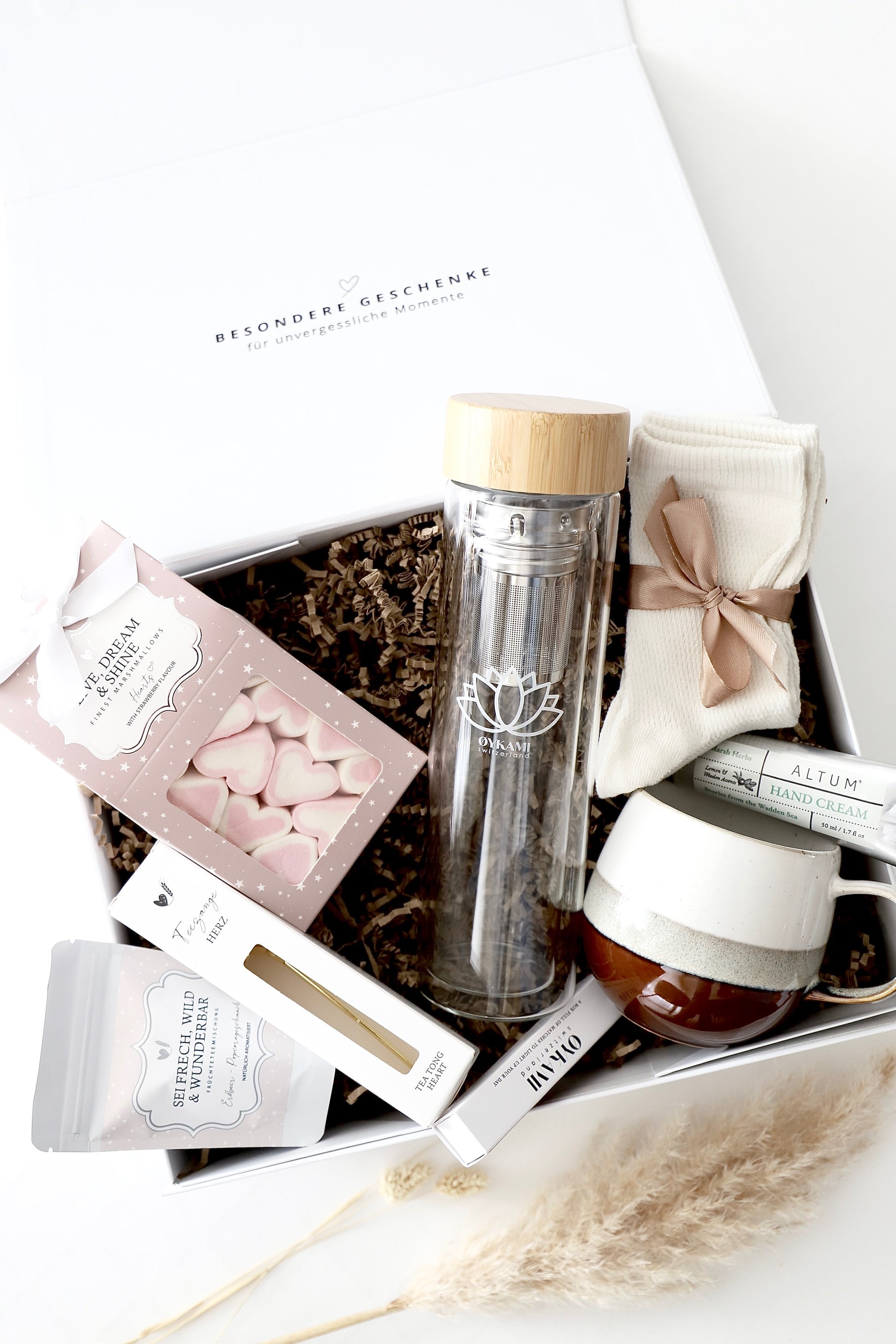 Unsere Geschenkboxen sind so liebevoll zusammengestellt, genau wie Du sie auf den Bildern siehst. Damit Deine Box immer harmonisch und besonders bleibt, wählen wir jedes Produkt mit ganz viel Herz und Sorgfalt aus. Nur in seltenen Fällen kann es vorkommen, dass ein einzelner Artikel auf dem Bild je nach Saison oder Verfügbarkeit durch eine gleichwertige Alternative ersetzt wird. Natürlich achten wir dabei darauf, dass Stil, Qualität, Farbe und Wert Deiner Box unverändert bleiben. So darfst Du Dich auf eine Geschenkbox freuen, die mit viel Liebe zum Detail für Dich gepackt wird – ein echtes Herzensgeschenk ♡