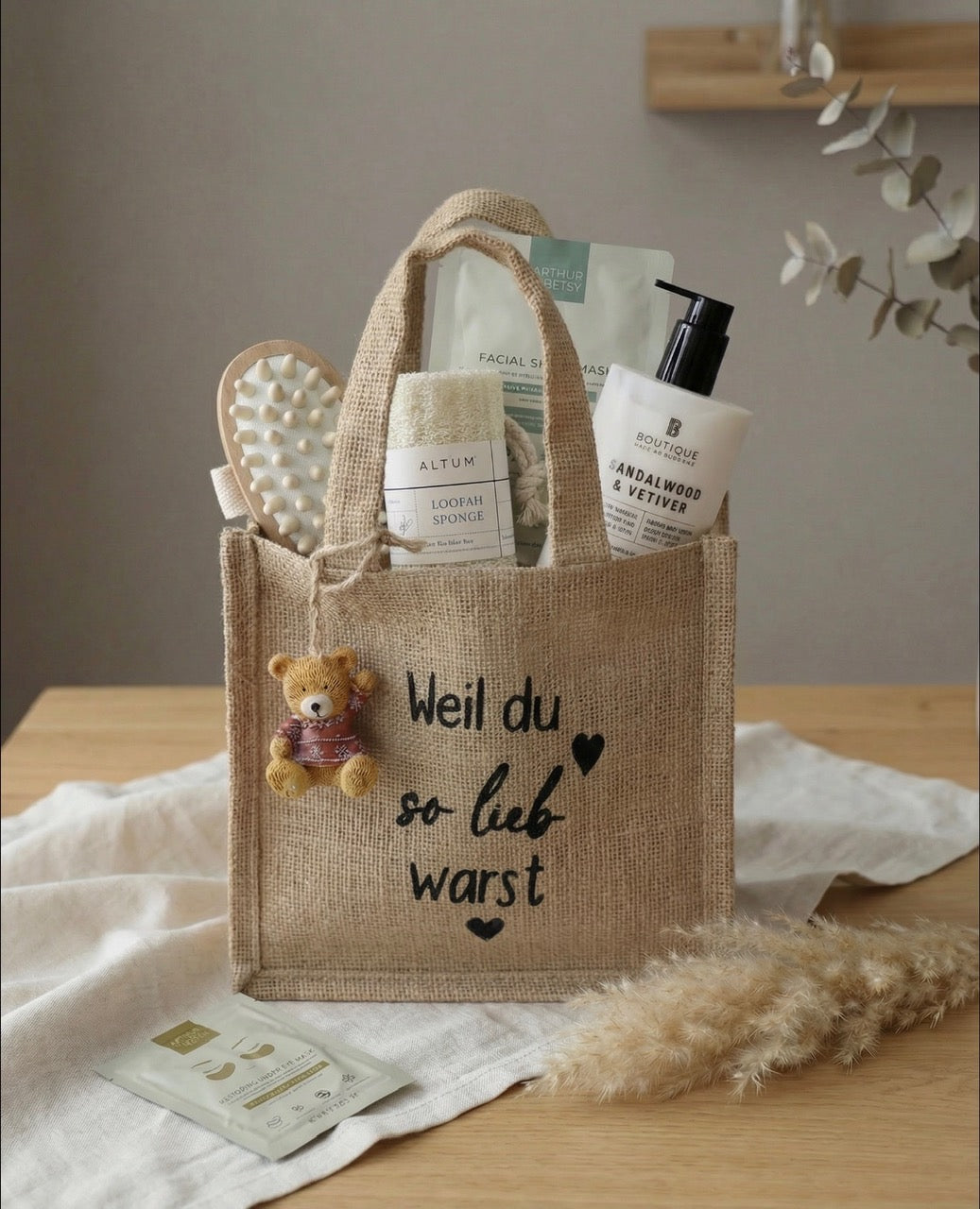 Die Geschenktasche „Weil du so lieb warst“ aus unserer LOVE Collection ist eine liebevoll zusammengestellte Geschenkidee für entspannte Wohlfühlmomente. Die stilvolle Jutetasche ist mit ausgewählten Beauty- und Selfcare-Produkten gefüllt, die den Alltag verschönern und kleine Auszeiten besonders machen.